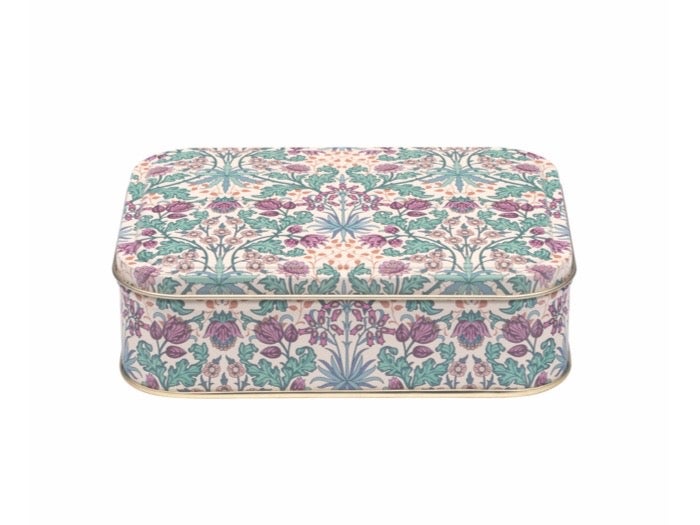 Kaunis peltirasia, jossa William Morrisin tyylikäs kuosi Hyacinth.